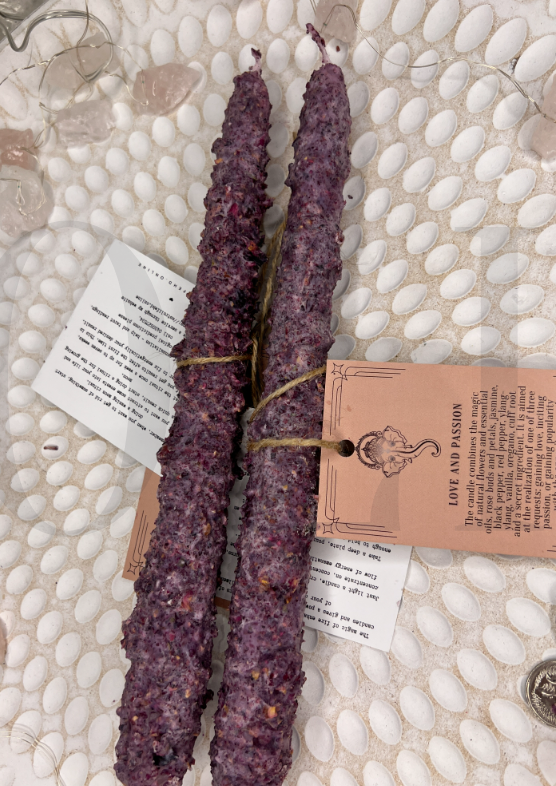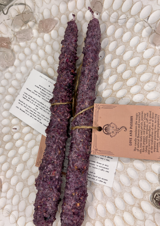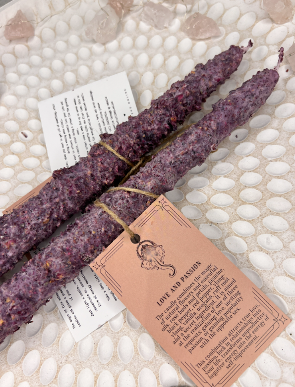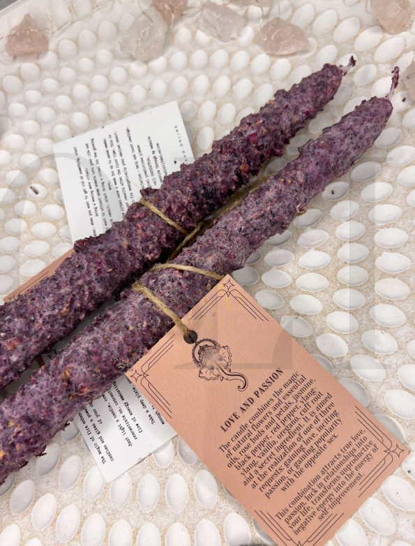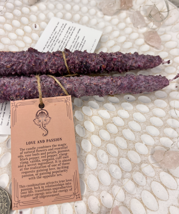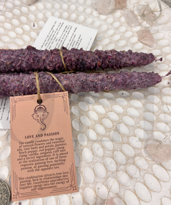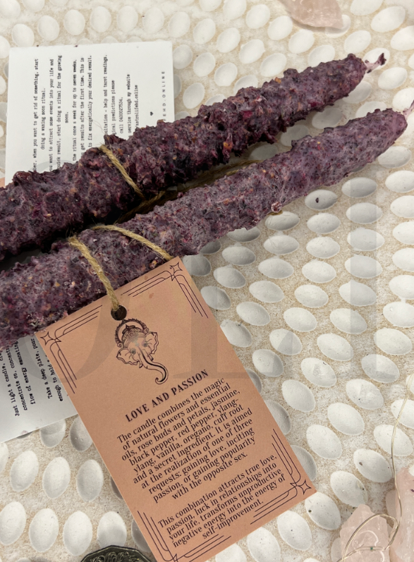 ✨Свічка поєднує в собі магію живих квітів та ефірних олій, бутонів та пелюсток троянд, жасмину, чорного перцю, червоного перцю, іланг-ілангу, ванілі, орегано, кореня манжети та секретного інгредієнта. Він спрямований на реалізацію одного з трьох запитів: завоювання любові, розпалювання пристрасті або завоювання популярності у протилежної статі.